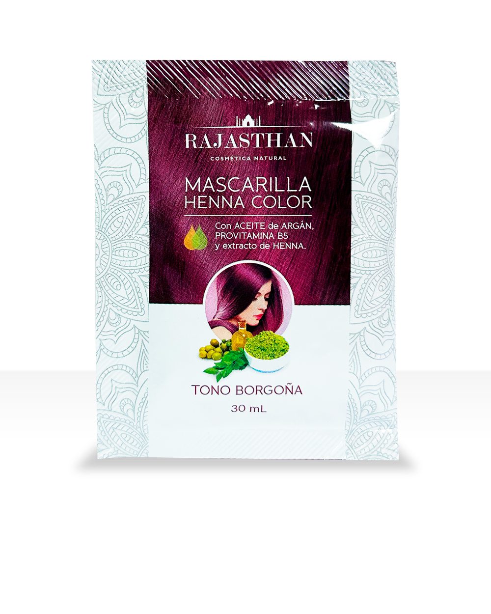 MASCARILLA HENNA COLOR RAJASTHAN EN PRESENTACIÓN EN SACHET DE 30 ML es una fórmula con Henna, Provitamina B5 y Aceite de Argán que nutre y acondiciona el cabello tinturado dejándolo suave y manejable después del shampoo.