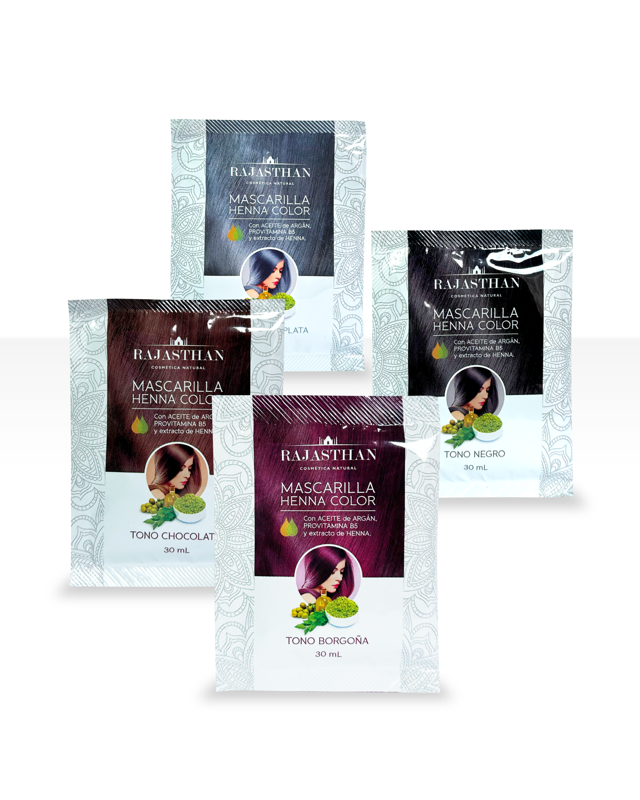 MASCARILLA HENNA COLOR RAJASTHAN EN PRESENTACIÓN DE 12 SACHETS DE 30 ML es una fórmula con Henna, Provitamina B5 y Aceite de Argán que nutre y acondiciona el cabello tinturado dejándolo suave y manejable después del shampoo.